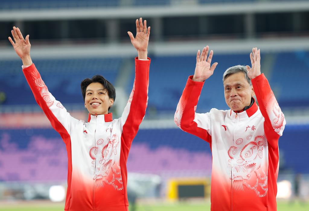 11月19日,廣東隊選手劉景揚(左)與教練在頒獎儀式上。新華社記者 黃偉 攝