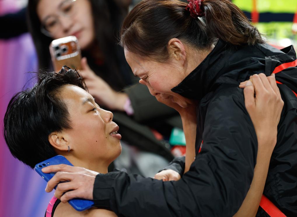 11月19日,廣東隊選手劉景揚(左)在比賽後和母親交流。她奪得冠軍。新華社記者 黃偉 攝