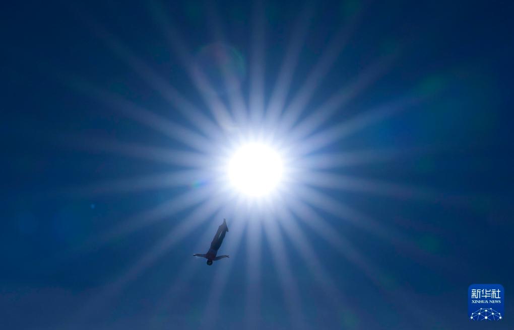 2012年1月7日,第12屆全國冬季運動會自由式滑雪空中技巧規定動作的比賽在吉林市北大壺滑雪場舉行。圖為齊齊哈爾市隊的女選手孔凡鈺在比賽中進行空中翻轉時,仿佛從太陽的光暈上滑下來。新華社記者費茂華攝