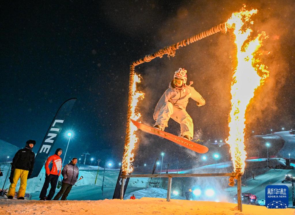 2025年1月29日,在坐落於阿勒泰市城區的新疆將軍山國際滑雪度假區,雪友在新春趣味滑雪公園跳&活動中鑽過火圈。新華社記者陳朔攝