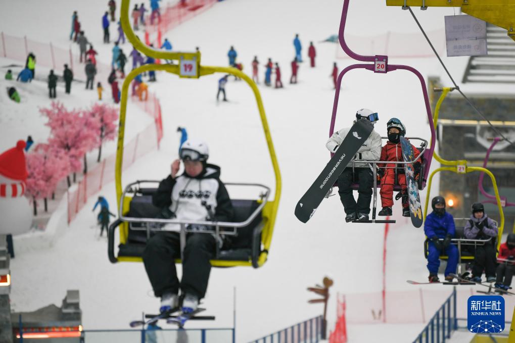 2025年1月12日,在成都熱雪奇蹟室內滑雪場,滑雪愛好者搭乘索道前往高級道。新華社記者胥冰潔攝