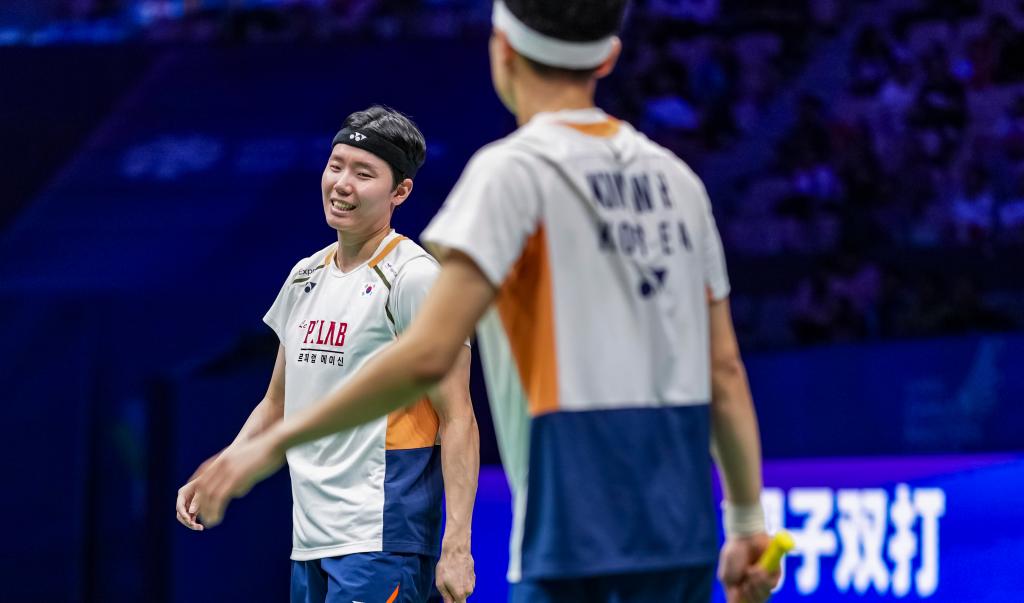 韓國選手徐承宰(左)在2025印尼羽毛球公開賽中。新華社記者 孫非 攝