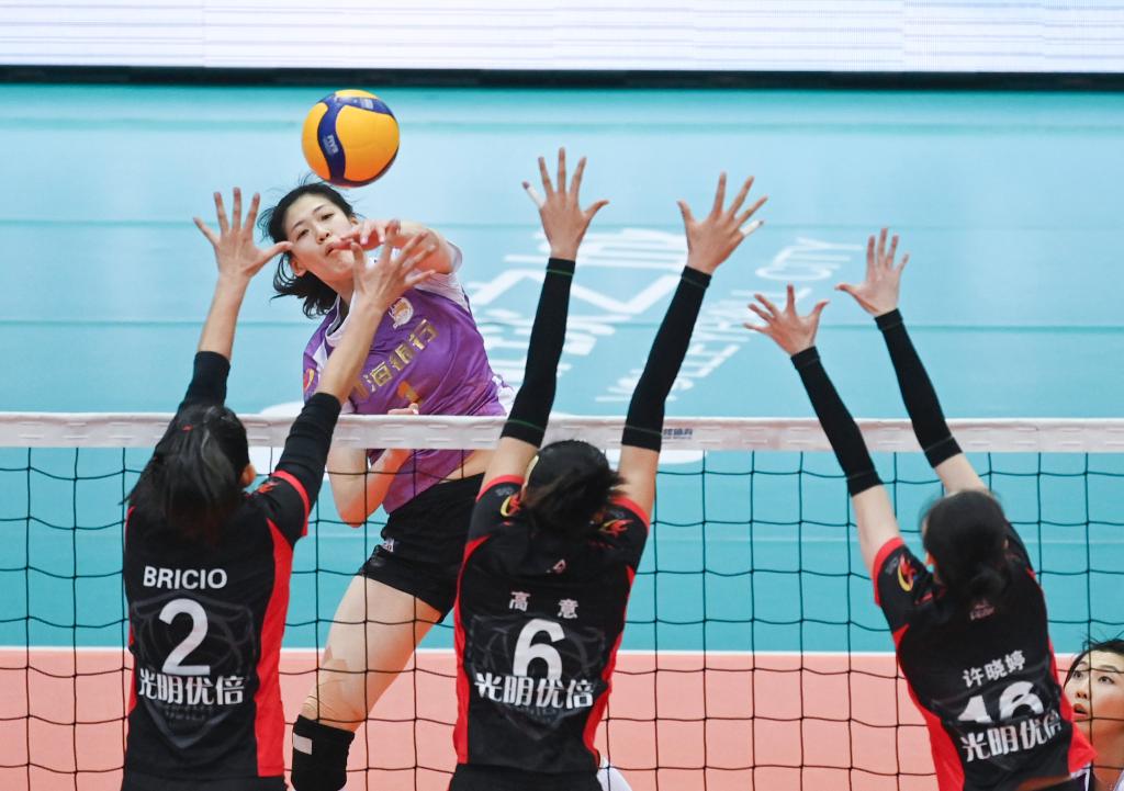 李盈瑩(左二)在比賽中扣球(資料圖)。新華社記者 趙子碩 攝