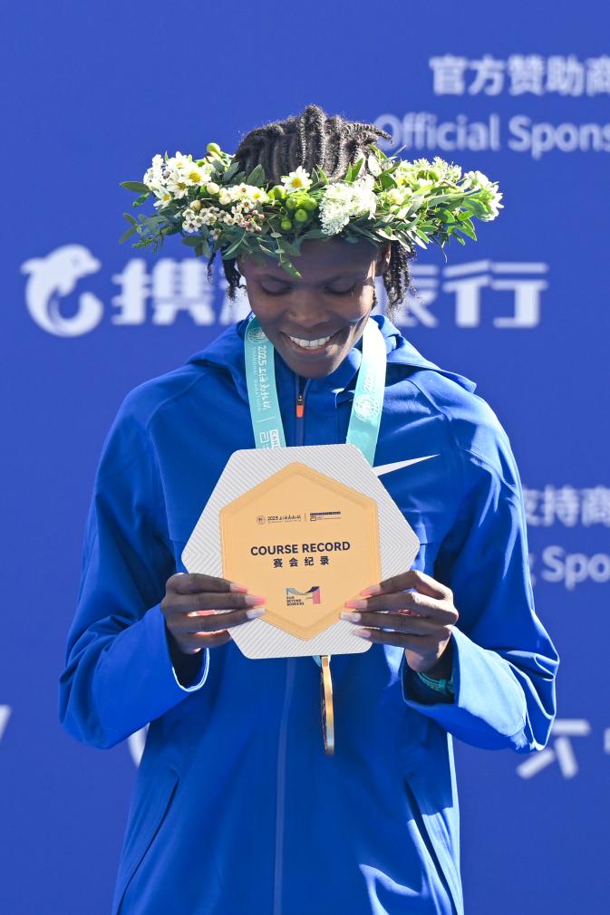 11月30日,女子組冠軍肯尼亞選手布裏吉德·科斯蓋在頒獎儀式上。 新華社記者 陳浩明 攝