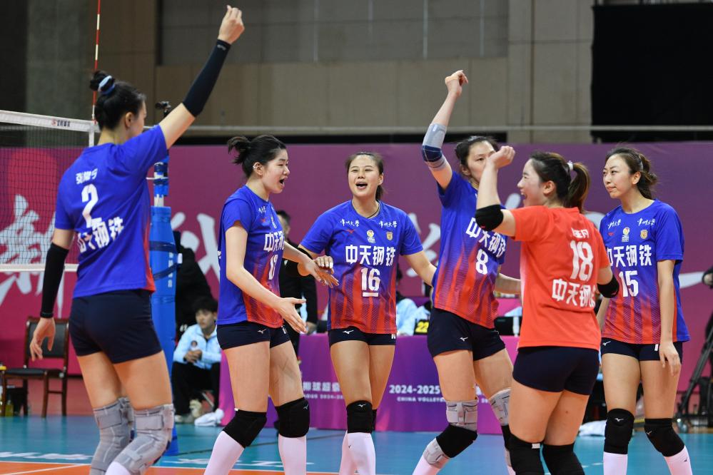 在2024-2025賽季中國女子排球超級聯賽(A級)冠軍爭奪戰中,江蘇中天鋼鐵隊以2比0的總比分戰勝上海光明優倍隊,奪得冠軍。新華社發(史康攝)