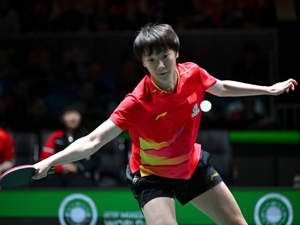 12月2日,中國隊選手王曼昱在女單比賽中回球。新華社記者 胥冰潔 攝