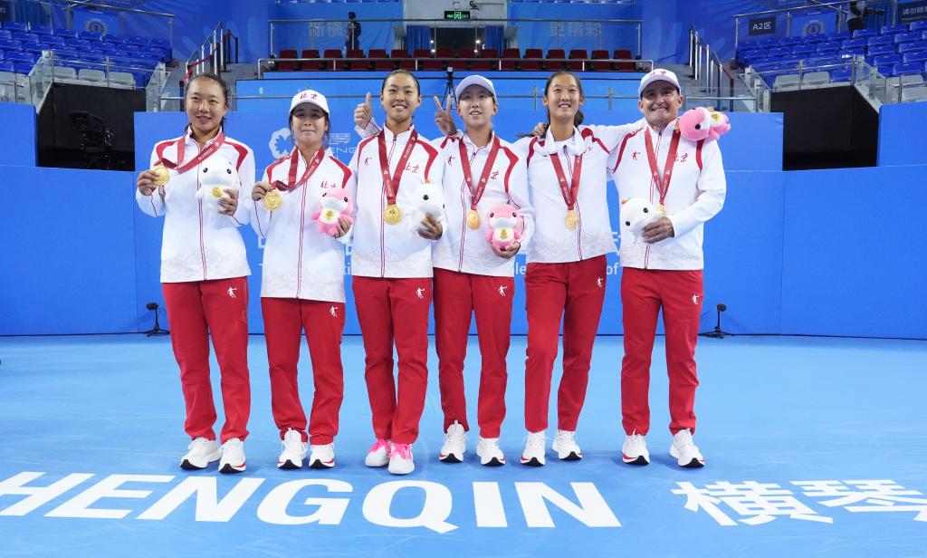 11月12日,冠軍北京隊在頒獎儀式後合影。當日,在橫琴進行的第十五屆全國運動會網球項目青年組女子團體決賽中,北京隊2比1戰勝湖北隊,奪得冠軍。新華社記者 顏麟蘊 攝