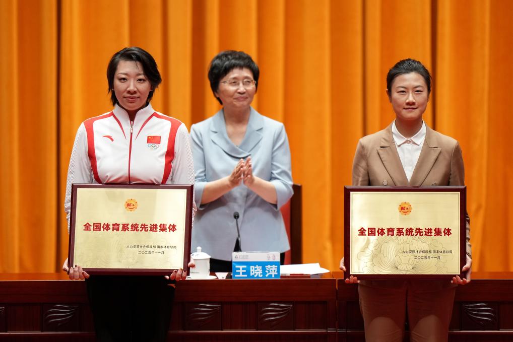 11月10日,北京市先農壇體育運動技術學校校長丁寧(右)、國家藝術體操隊集體組教練孫丹(左)在全國群眾體育先進及體育系統先進表彰大會上接受表彰。新華社記者 江漢 攝