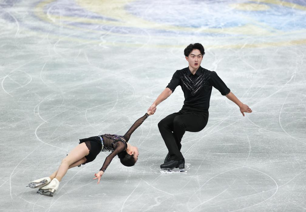 12月4日,中國組合郭蕊(左)/張益文在青年組雙人滑短節目比賽中。新華社記者 岳晨星 攝