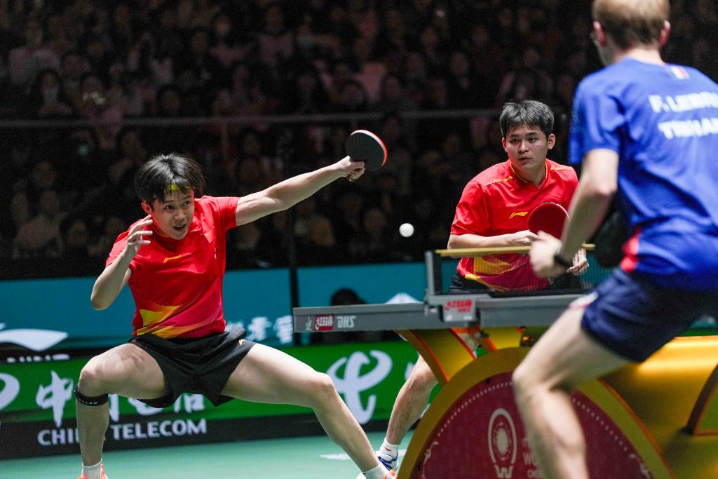 12月4日,中國隊組合王楚欽(左)/林詩棟在男雙比賽中。新華社記者 王迎 攝