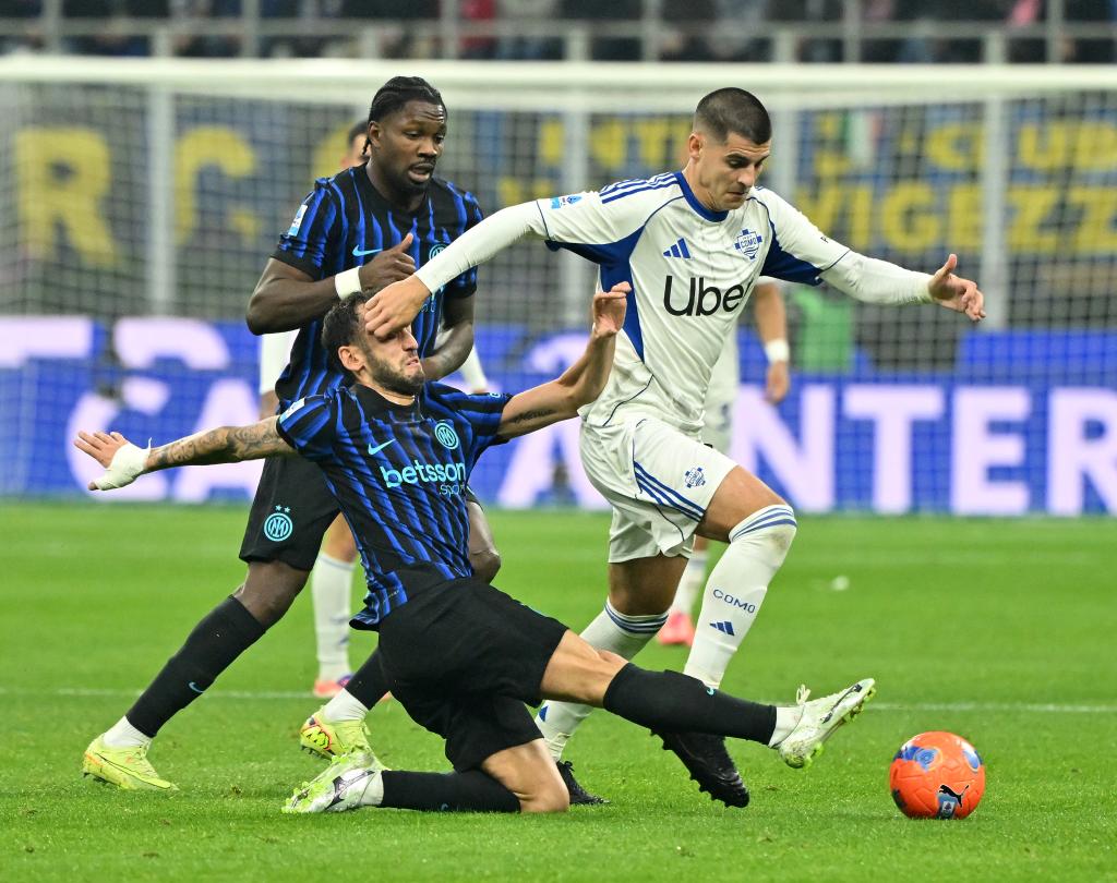 12月6日,國際米蘭隊球員圖拉姆(左上)、恰爾汗奧盧(左下)與科莫隊球員莫拉塔在比賽中拼搶。新華社發(阿爾貝托·林格利亞攝)