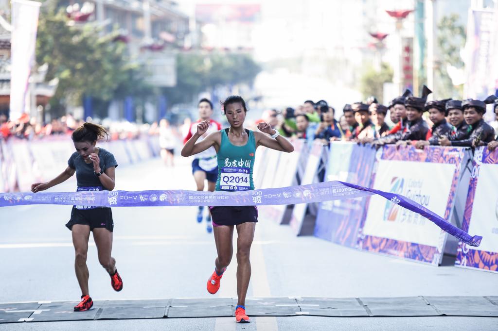 2018年12月2日,中國選手姚妙(右)以7小時07分49秒的總成績獲女子組全程冠軍。當日,2018貴州環雷公山超100公里國際馬拉松在貴州省從江縣進行了最後一個賽段21.0975公里的比賽。新華社記者 陶亮 攝
