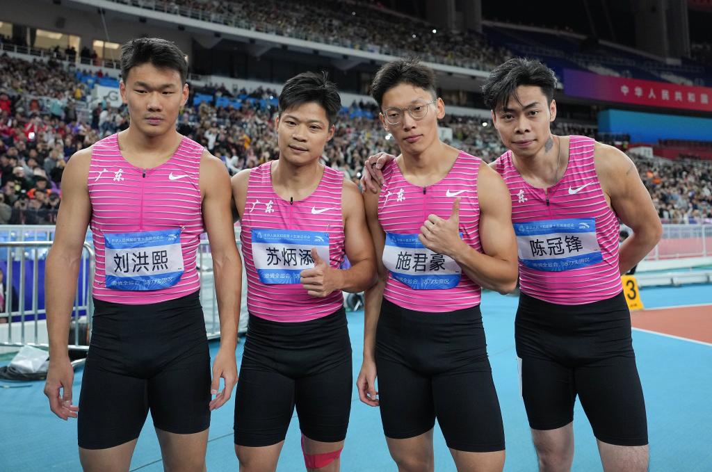 11月20日,廣東隊選手劉洪熙、蘇炳添、施君豪、陳冠鋒(從左至右)在第十五屆全國運動會田徑男子4X100米接力決賽後。新華社記者江漢攝