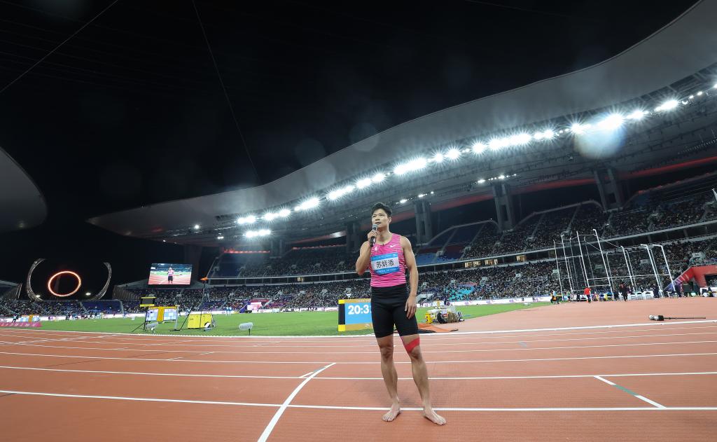 11月20日晚的全運會男子4X100米接力決賽後,當粵語歌《講不出再見》響起,蘇炳添脫下釘鞋,向觀眾揮手告別。
