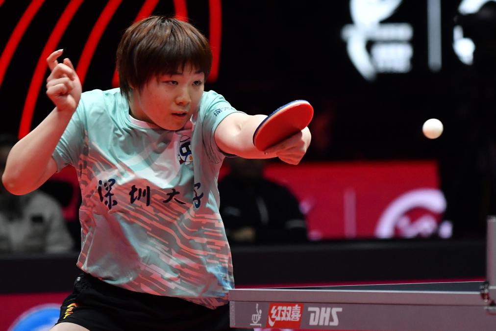 12月26日,深圳大學隊選手蒯曼在女單比賽中回球。新華社發(劉臻睿攝)