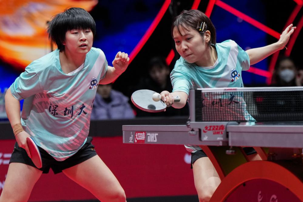 12月26日,深圳大學隊組合覃予萱/平野美宇(右)在女雙比賽中。新華社記者 李博 攝