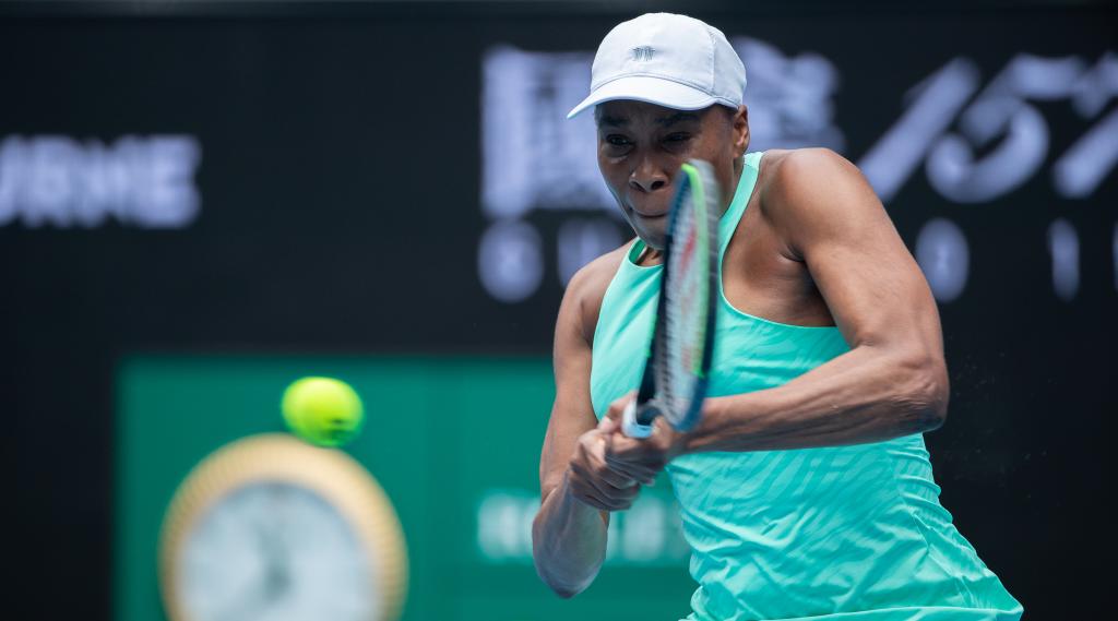 2021年2月8日,美國選手維納斯·威廉姆斯在澳網女單首輪比賽中回球。新華社發(胡涇辰 攝)