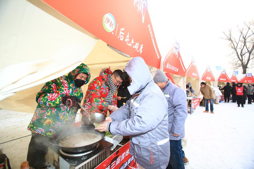 這是雪地足球“村超”聯賽啟動儀式現場,市集上的東北菜