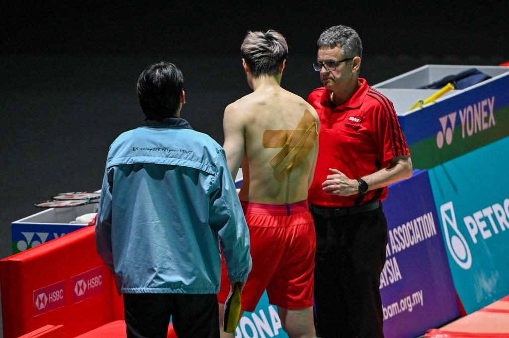 ↑1月11日,中國選手石宇奇(中)在男單決賽中因傷退賽