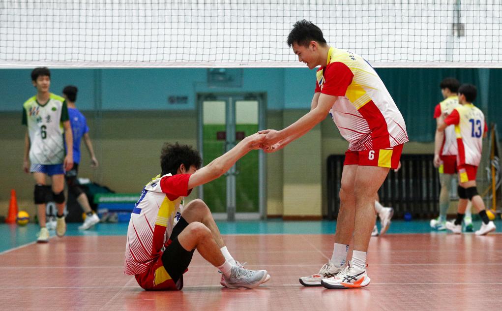 ↑北京景山學校排球隊高中組球員陳宣霖(前右)在訓練賽中扶起隊友