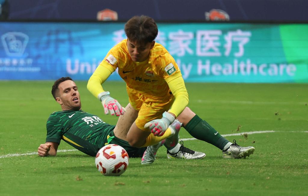北京國安隊球員塞爾吉尼奧(左)和青島西海岸隊守門員李昊在比賽中拼搶。新華社記者 王楷焱 攝