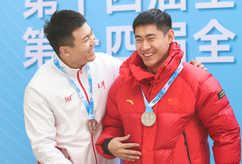 2023年11月28日,獲得亞軍的孫楷智/丁嵩(左)在頒獎儀式上。當日,第十四屆全國冬季運動會男子雙人雪車頒獎儀式在國家雪車雪橇中心舉行。新華社記者 王楷焱 攝