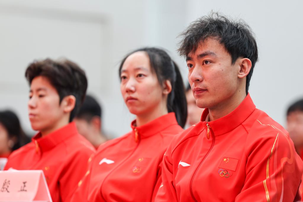 1月27日,鋼架雪車運動員殷正(右一)、趙丹(右二)在米蘭冬奧會中國體育代表團成立動員大會上。新華社記者 那宇奇 攝