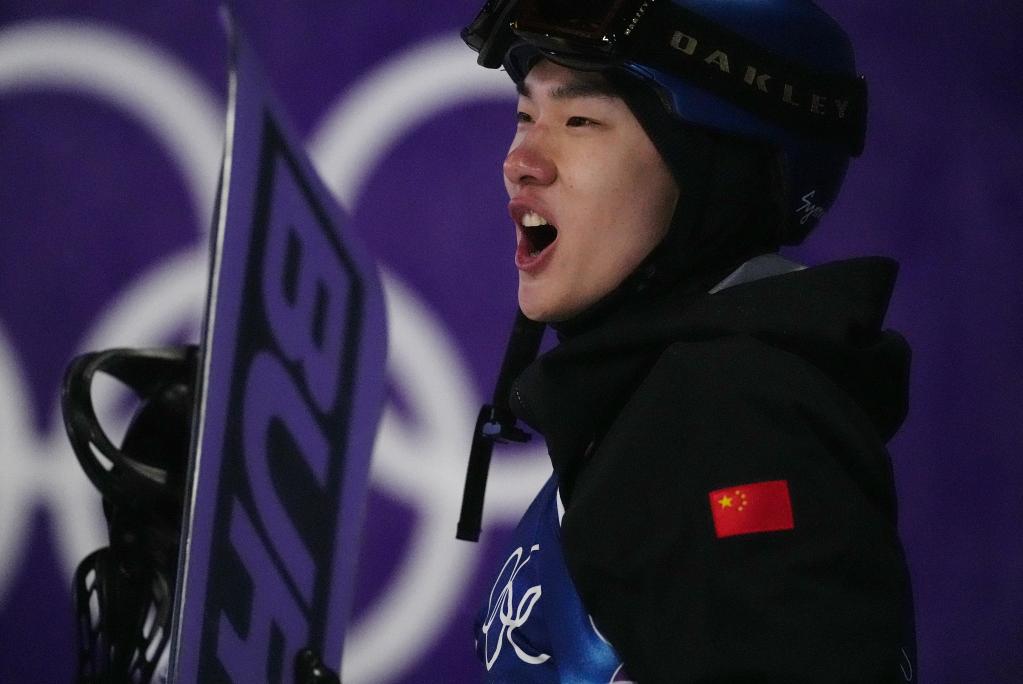 2月5日,蘇翊鳴在第三跳後慶祝。新華社記者 鄔惠我 攝