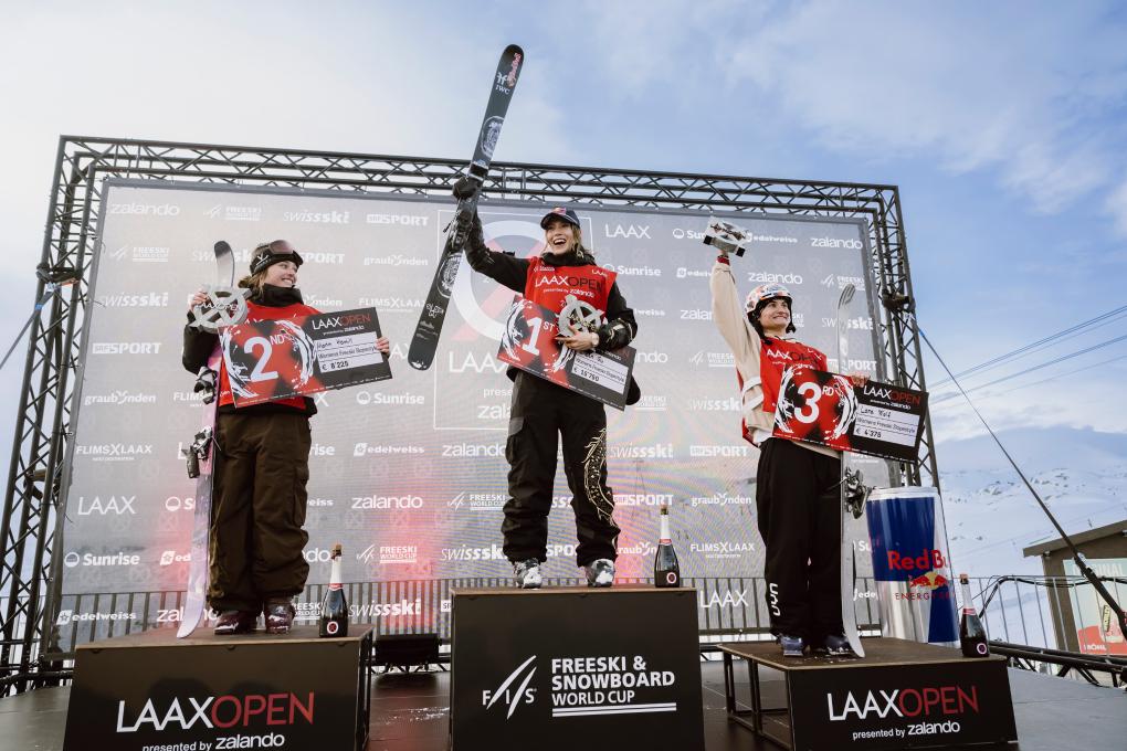 2026年1月17日,在瑞士萊克斯舉行的國際雪聯世界盃系列賽中獲得女子自由式滑雪坡面障礙技巧冠軍的谷愛凌(中)在領獎&上。新華社發(馬塞爾·萊默希特 攝)