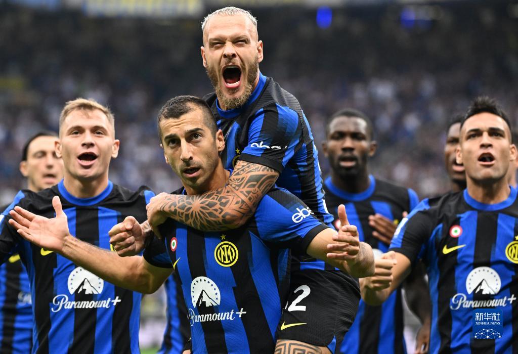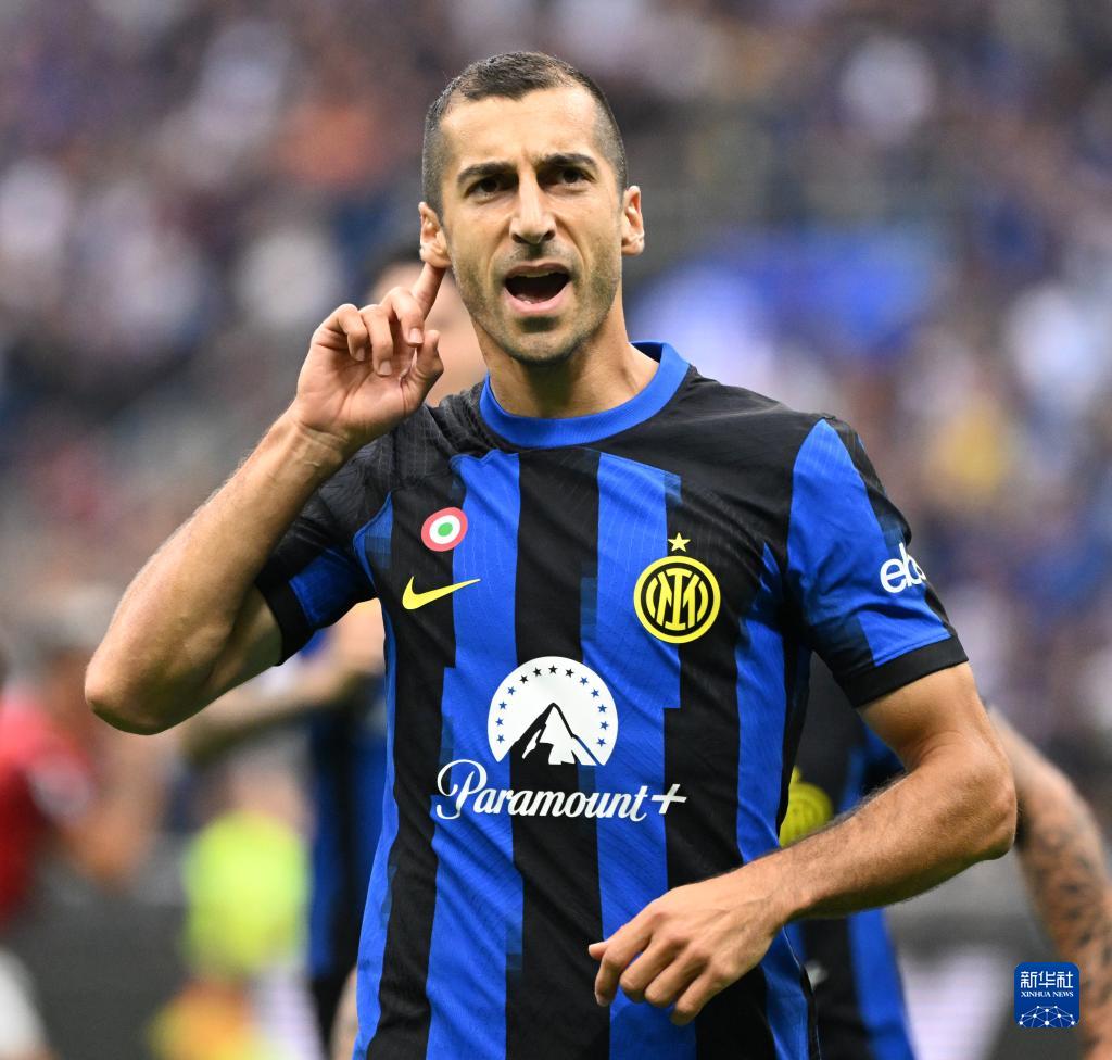 9月16日,国际米兰队球员姆希塔良进球后庆祝。新华社发(阿尔贝托·林格利亚摄)