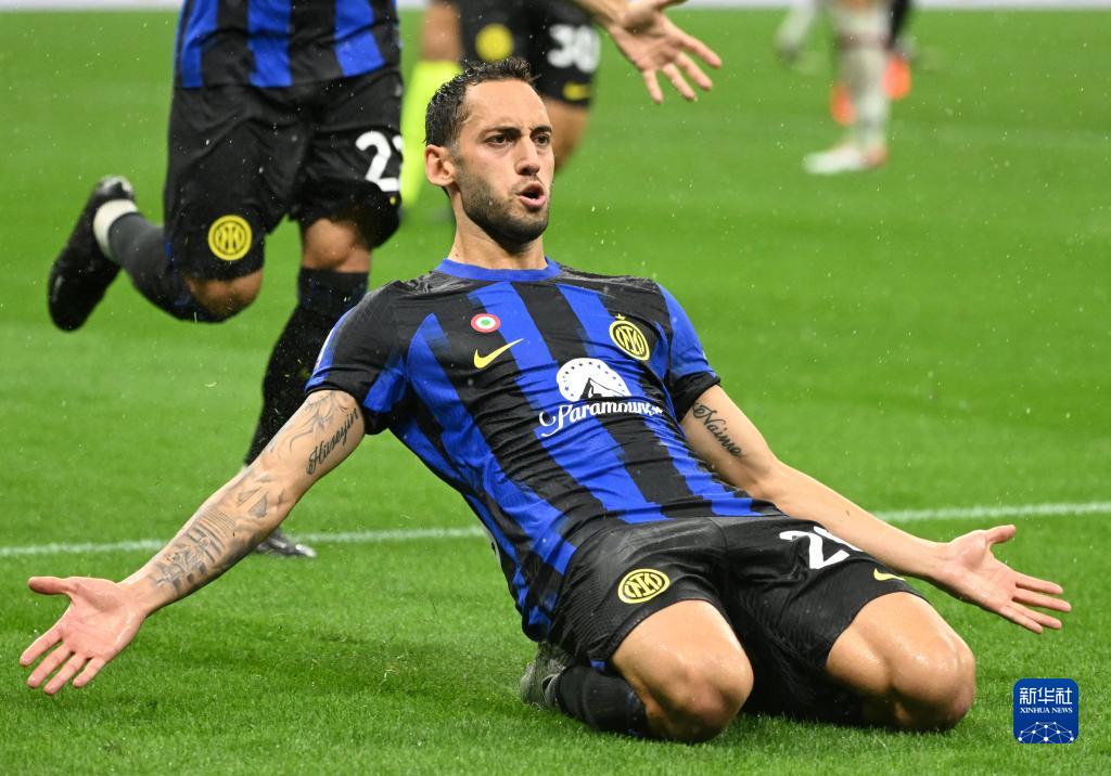 9月16日,国际米兰队球员恰尔汗奥卢进球后庆祝。新华社发(阿尔贝托·林格利亚摄)