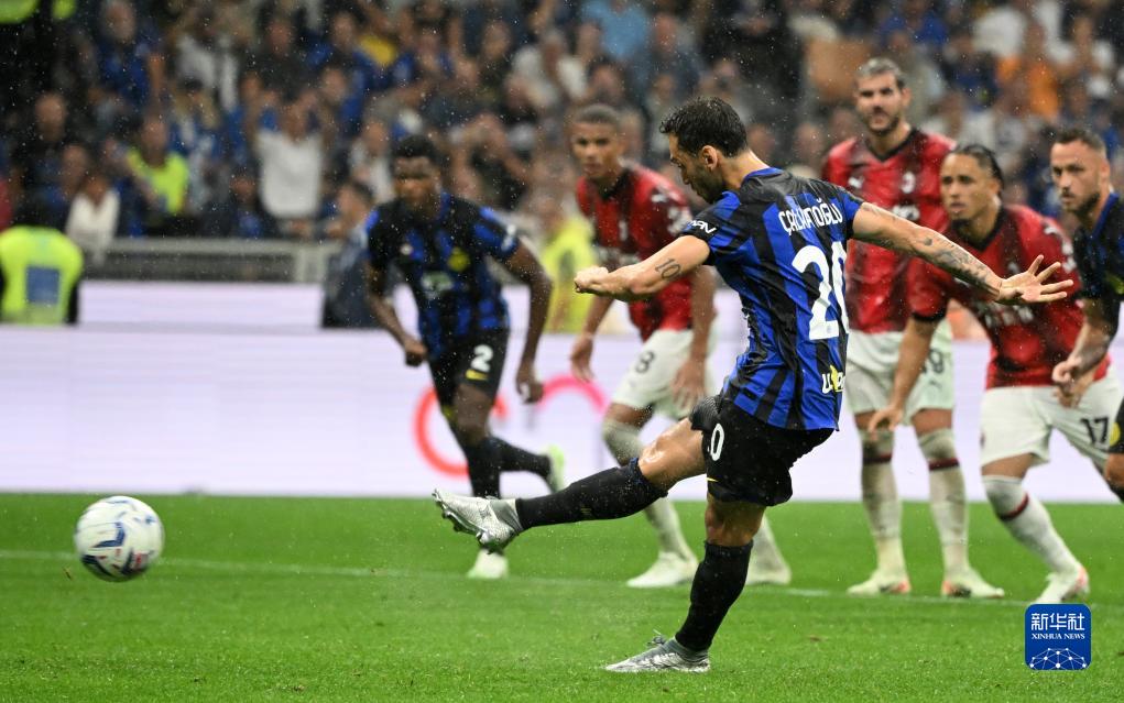 9月16日,国际米兰队球员恰尔汗奥卢(左)主罚点球命中。新华社发(阿尔贝托·林格利亚摄)