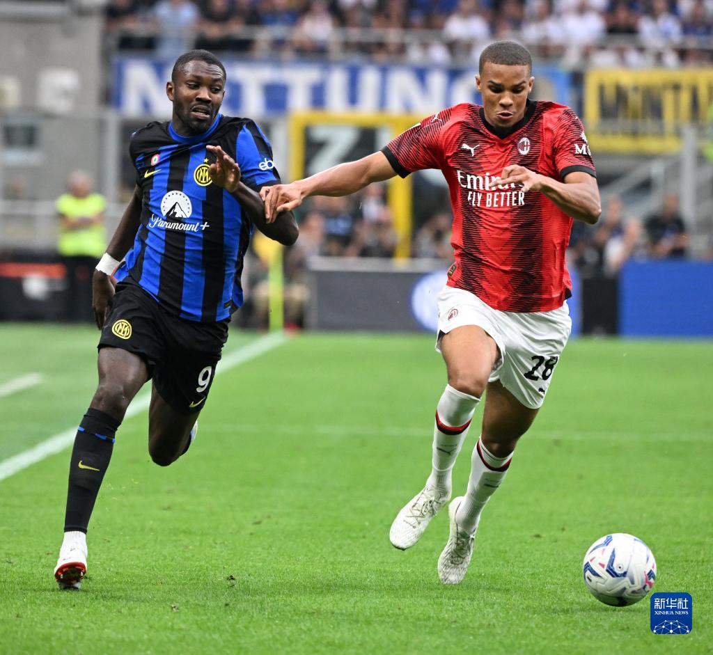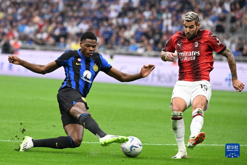 9月16日,国际米兰队球员邓弗里斯(左)与AC米兰队球员特奥·埃尔南德在比赛中拼抢。新华社发(阿尔贝托·林格利亚摄)