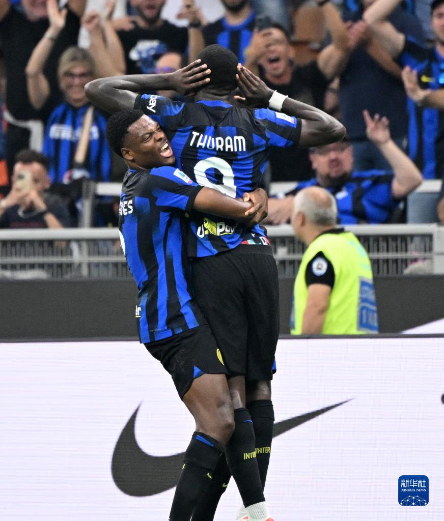 9月16日,国际米兰队球员图拉姆(右)进球后与队友邓弗里斯庆祝。新华社发(阿尔贝托·林格利亚摄)