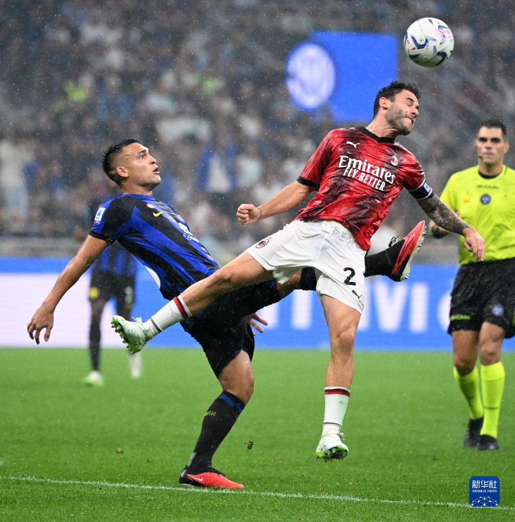 9月16日,国际米兰队球员劳塔罗(左)与AC米兰队球员卡拉布里亚在比赛中拼抢。新华社发(阿尔贝托·林格利亚摄)