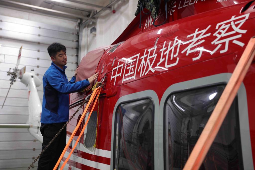 “雪龍2”號直升機機組在起飛前進行安全確認。新華社發(武佳星 攝)