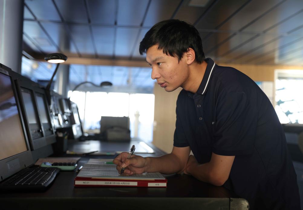 5月2日,“雪龍2”號實習三副李浩瑋在駕駛&值班。新華社記者 黃韜銘 攝