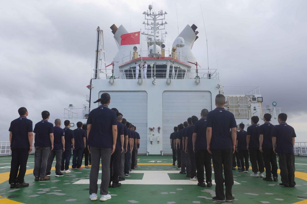 4日清晨,考察隊員們早早來到甲板集合。隨着雄渾國歌在海上奏響,隊員們面朝國旗,行注目禮。