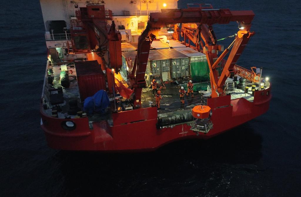 夜間,考察隊員在甲板進行大洋作業(無人機照片)。新華社發(梁洲瑞 攝)