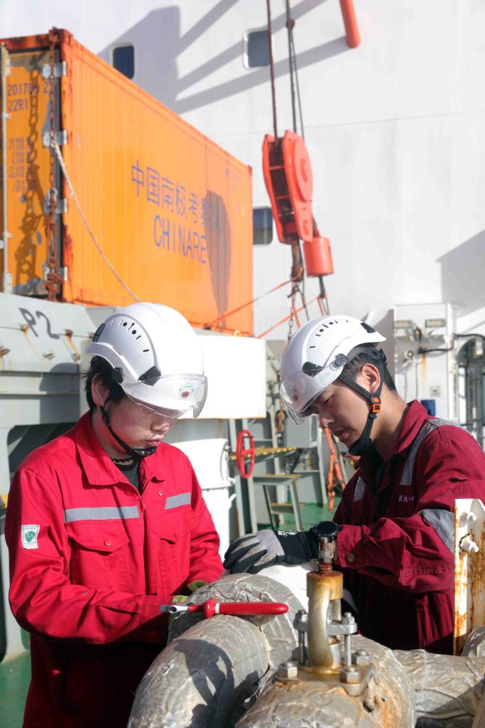 5月2日,“雪龍2”號系統工程師王斌(右)和系統管理員楊立偉在甲板檢修設備。新華社記者 黃韜銘 攝