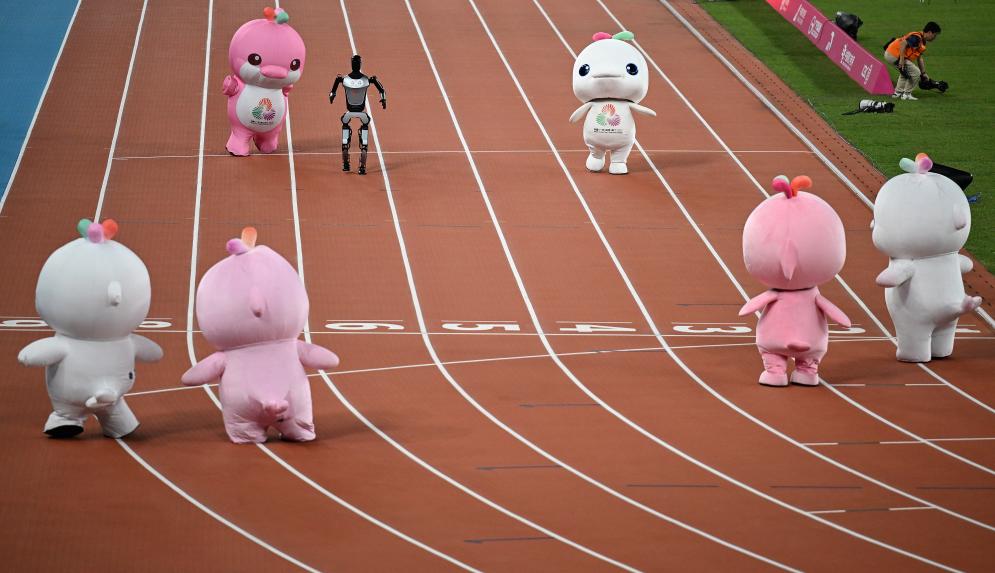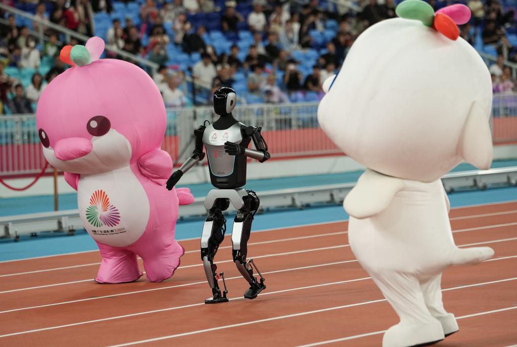 11月17日,在田徑項目賽事開始前的暖場活動中,機器人和吉祥物喜洋洋、樂融融在廣東奧體中心體育場賽跑。