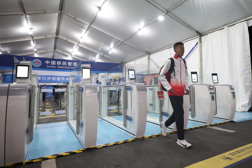 11月15日,全運會歷史上首個跨境馬拉松賽事開賽前,參賽選手在深圳灣口岸前置查驗區完成查驗手續。本次賽事通過智慧管理體系,實現了無感通關。