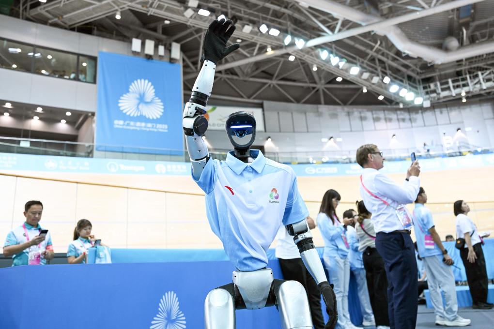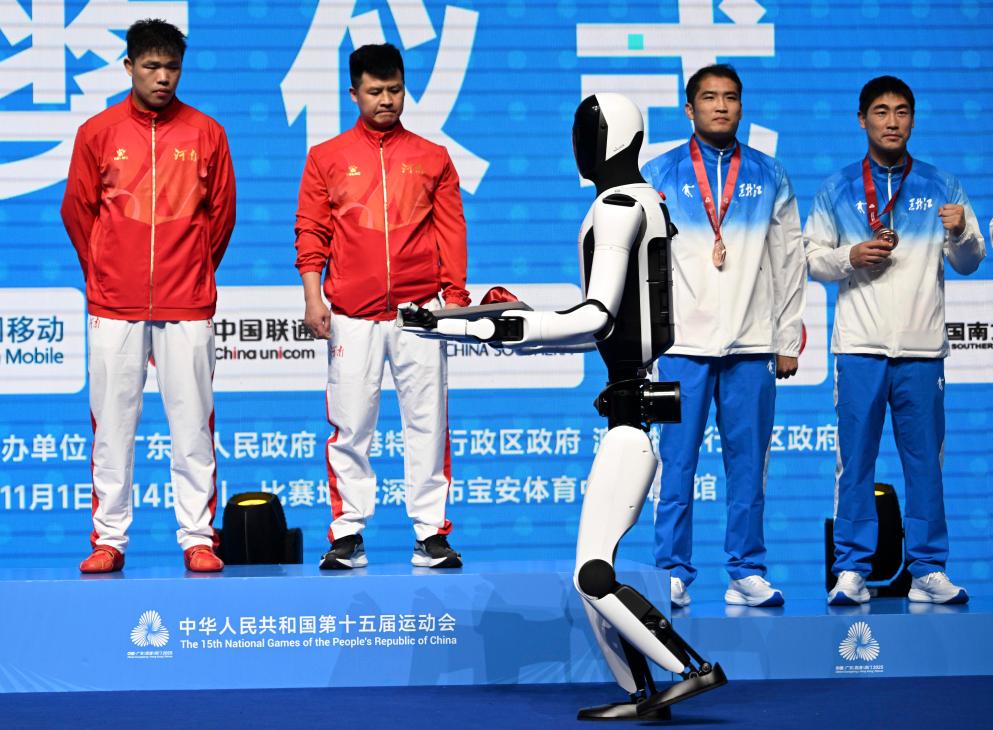 11月14日,人形機器人在拳擊男子92公斤級頒獎儀式上手捧獎牌。田徑賽場上