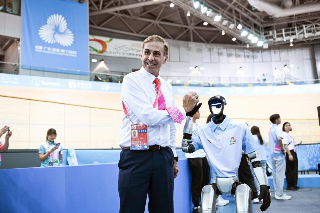 11月13日,一名賽事技術官員在場地自行車女子團體競速賽決賽前同參與表演的機器人擊掌合影。