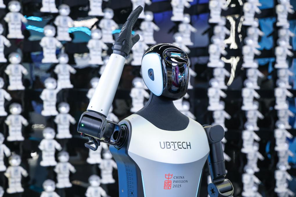 2025年4月23日,在深圳優必選科技展廳內,商用版人形機器人Walker C向觀眾揮手致意。“科技+體育”正加速成為