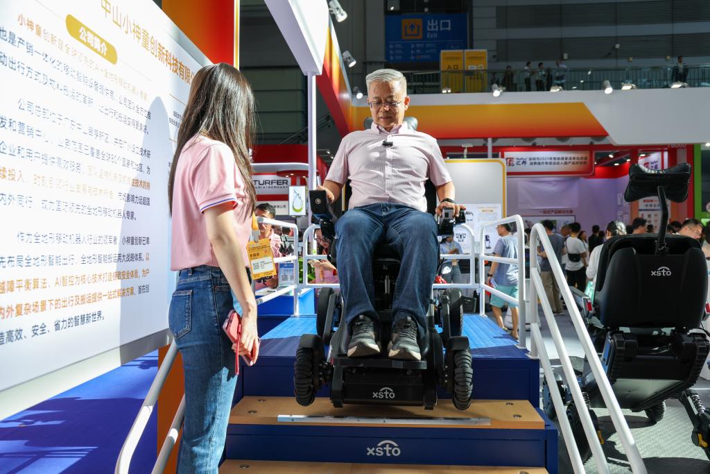 2025年9月12日,在2025深圳國際智慧養老産業博覽會上,觀眾在展會現場體驗一款可以上下樓梯的智能出行機器人。新華社記者 梁旭 攝