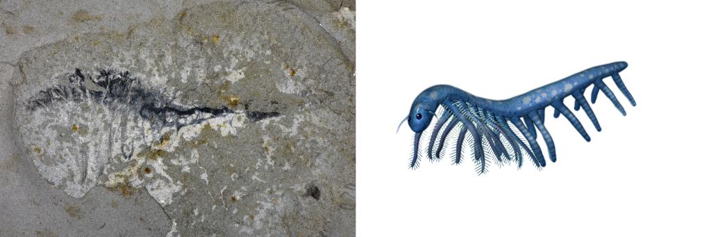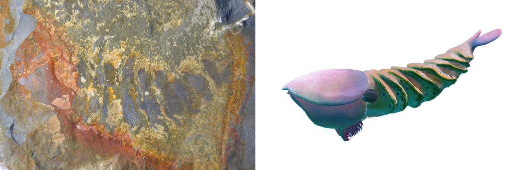 花垣生物群射齒類節肢動物-赫德蝦類化石圖(左)和復原圖。新華社發