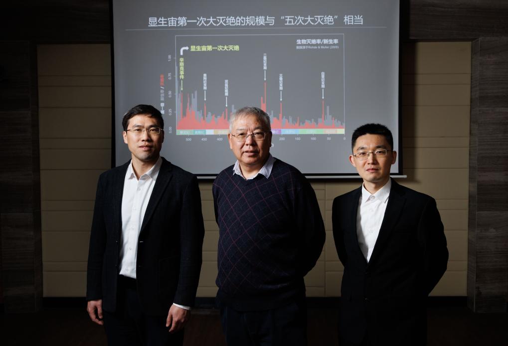 1月22日,在中國科學院南京地質古生物研究所實驗室,團隊部分成員:中國科學院院士、研究員朱茂炎(中),研究員趙方臣(左),副研究員曾晗(右)合影留念。新華社記者 金立旺 攝