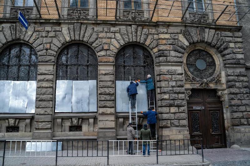 3月2日,工人在烏克蘭利沃夫為一處歷史建築做保護措施。新華社記者任珂攝
