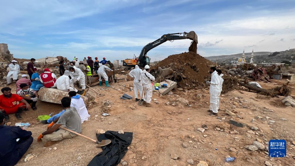 9月17日,救援人員在利比亞德爾納的受災地區工作。
